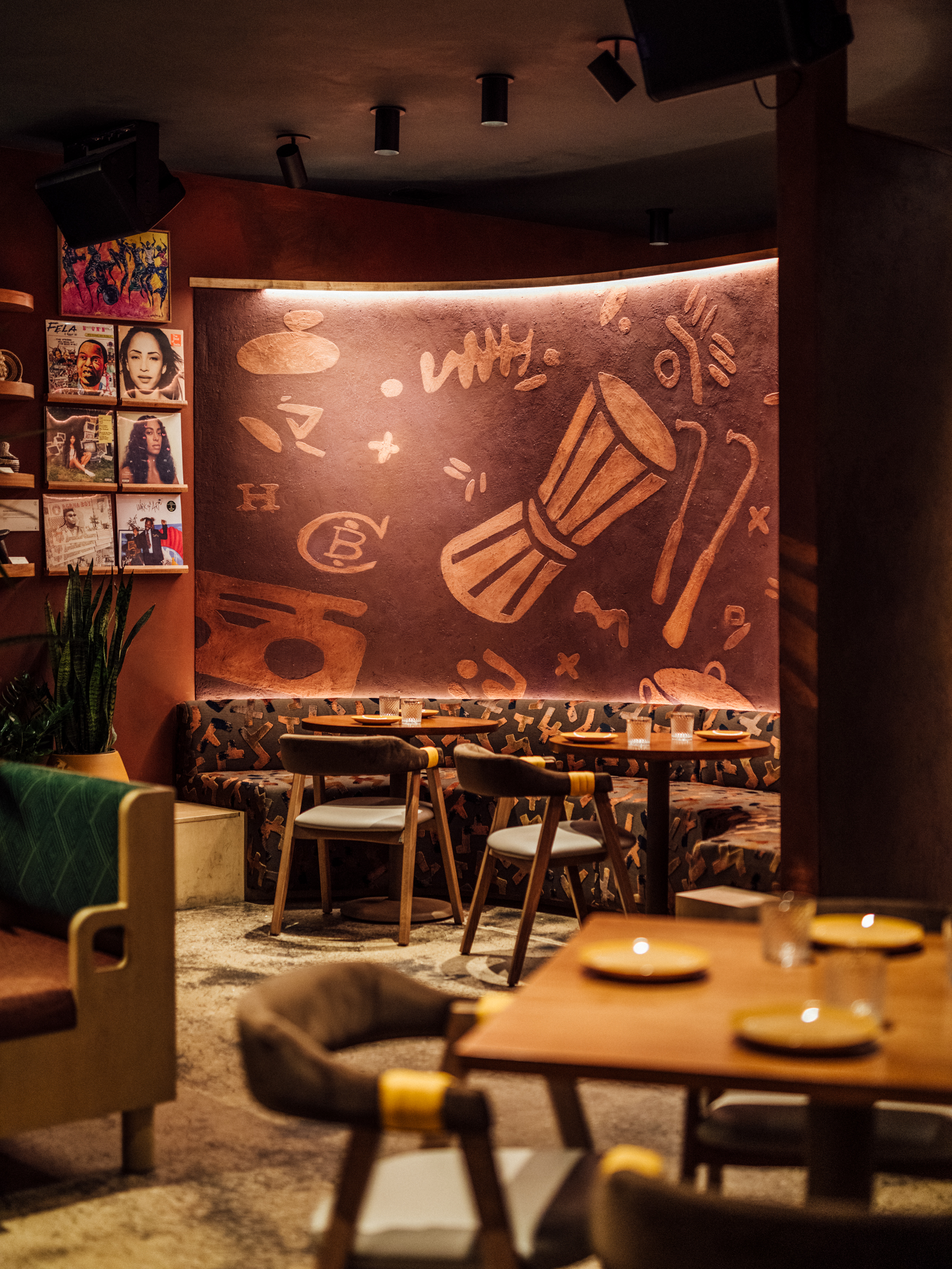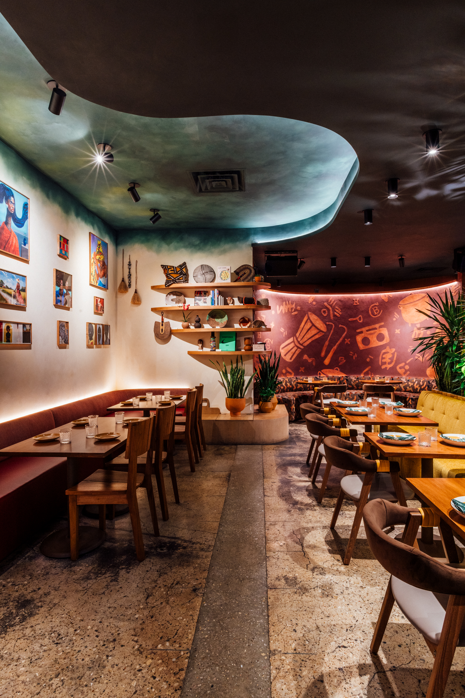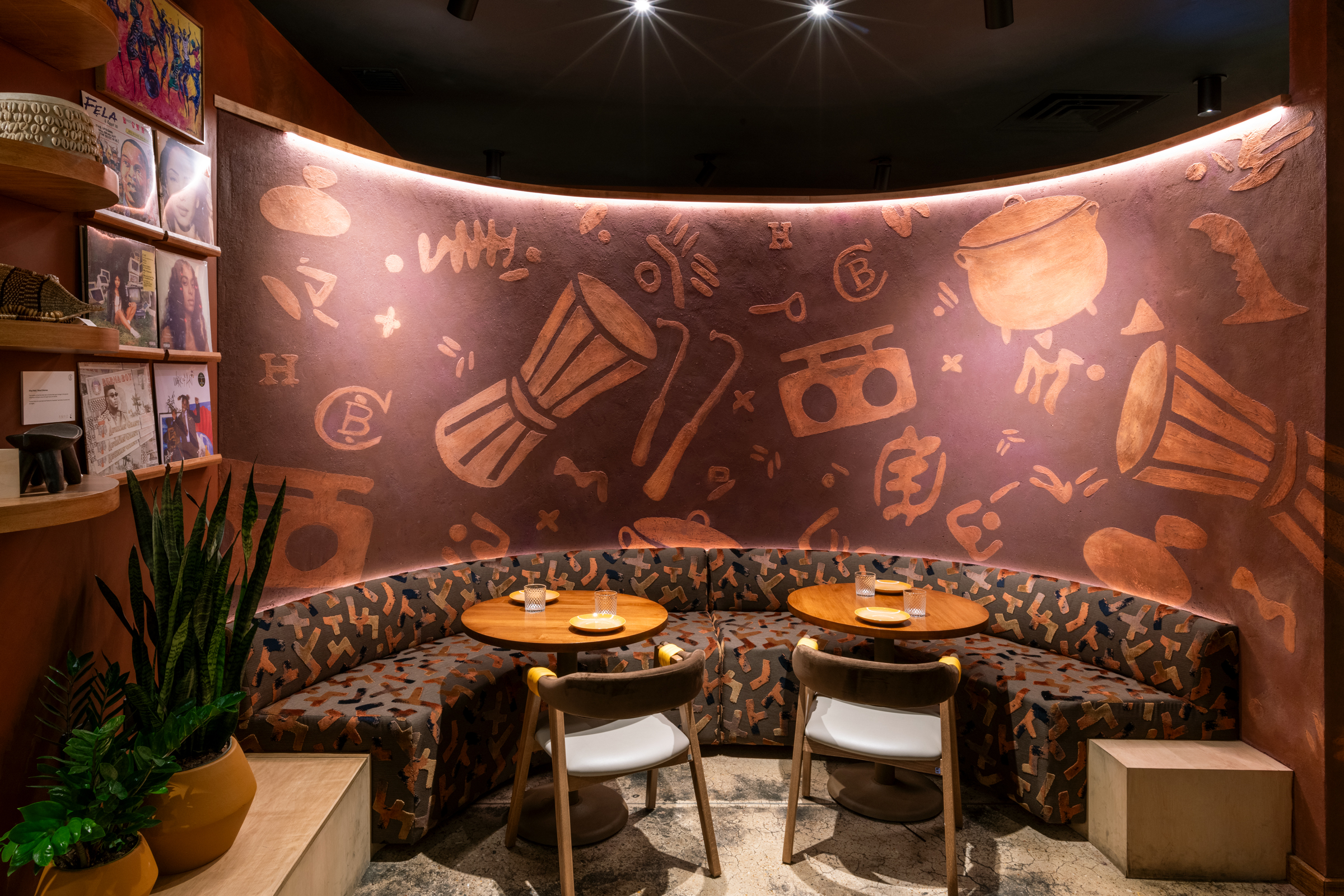 Architangent served as the architect alongside Gin Design Group as the interior designer for this West-African restaurant. The space was previously used as a seafood restaurant and the interior had odd angles and lacked a logical flow.