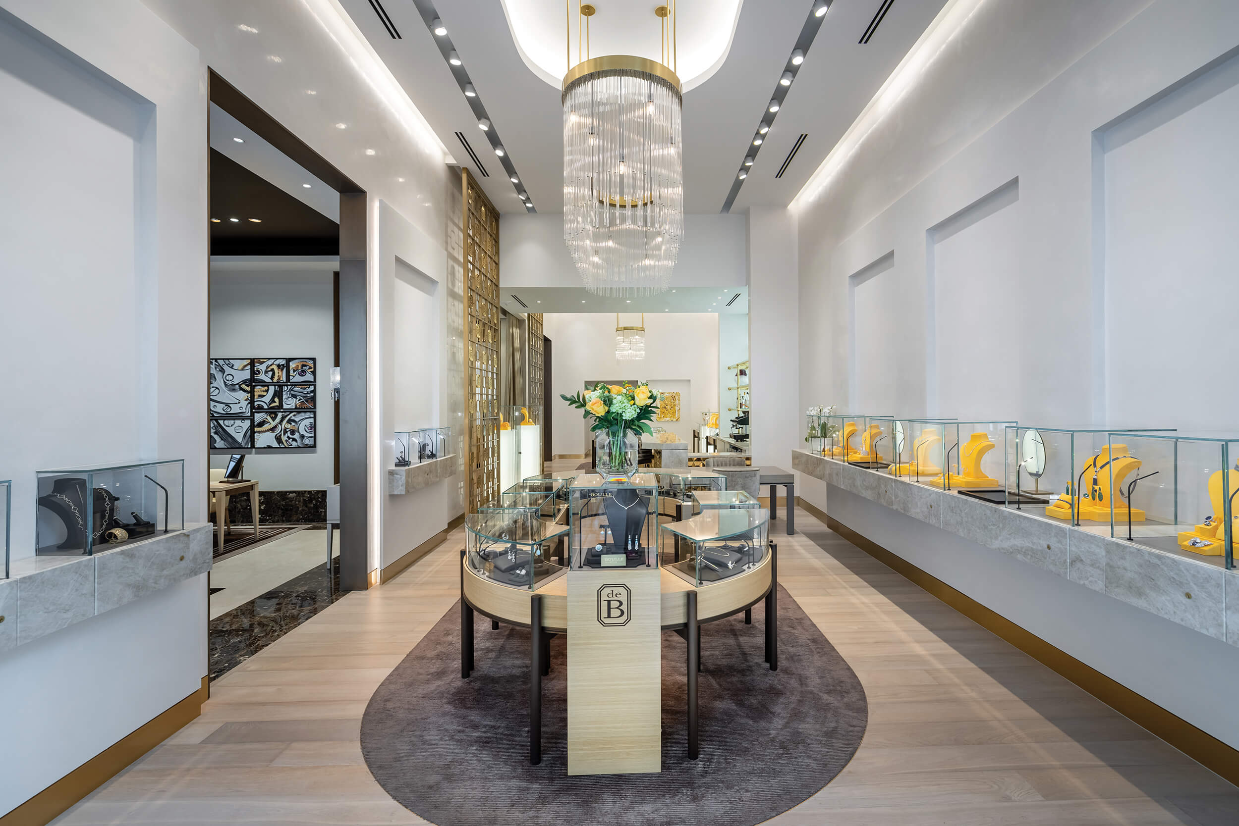 Working with the deBoulle existing designs in Dallas and Houston, we created a welcoming plan layout with a hospitality lounge that will serve as a diamond and gemstone showcase. The interior design blends portions of the Dallas and Houston retail locations while introducing new material selections and custom designs. As the local architect for the watchmakers, we were in constant communication with the brands to execute their vision and make the designs work together.